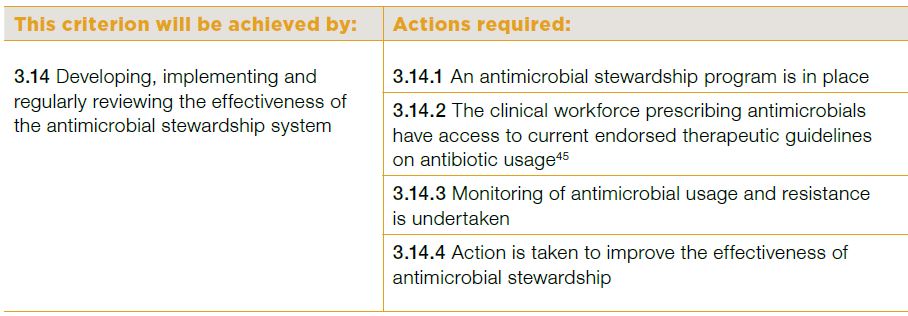 Under Australian hospital safety and quality accreditation standards, all facilities must have in place antimicrobial stewardship programs (criterion 3.14 below). These must involve audit and analysis of antimicrobial usage and promote adherence to the prescribing principles above.